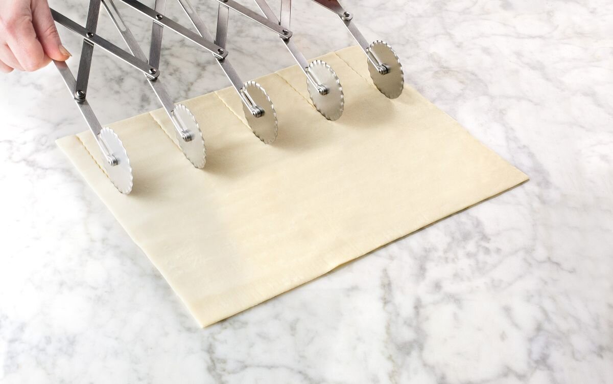 Spar tid og oppnå perfekte resultater hver gang! Deigkutteren er en kraftig, forlengbar deigskjærer med 5 riflete hjul som lar deg kutte flere jevne strimler i én enkelt bevegelse.