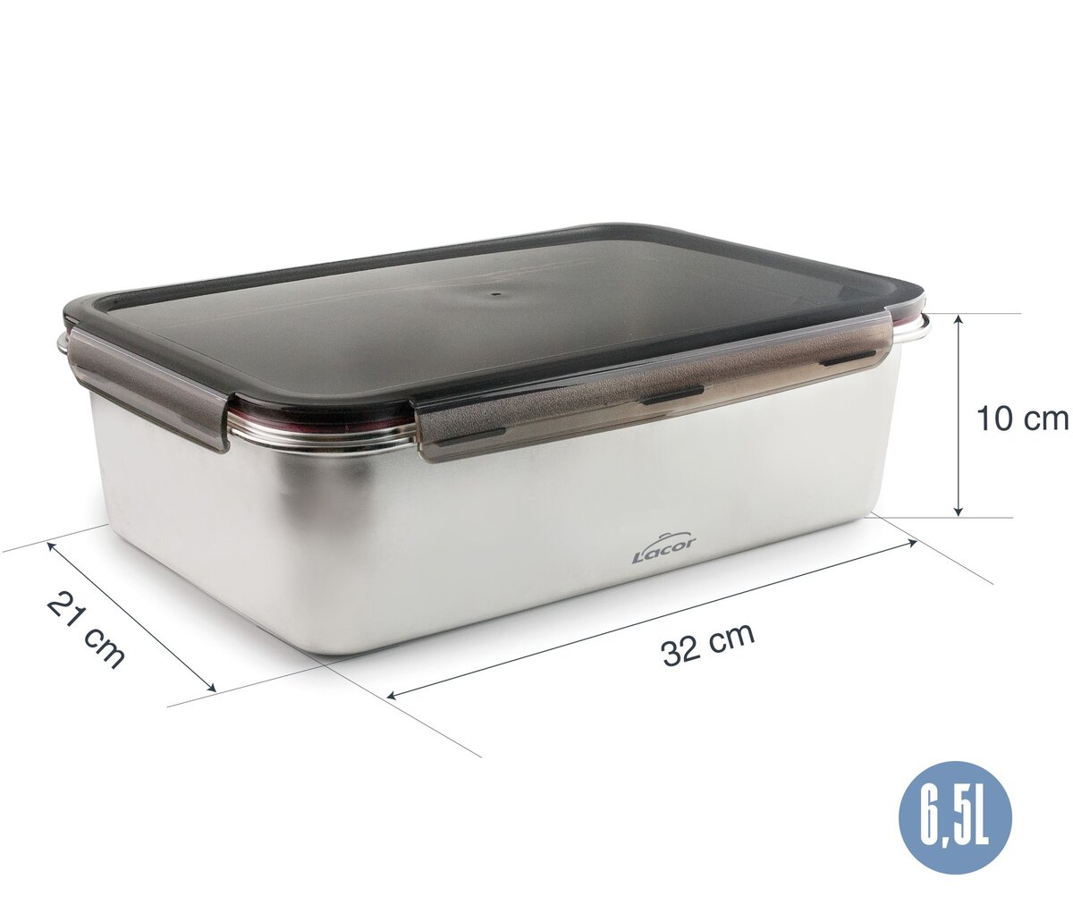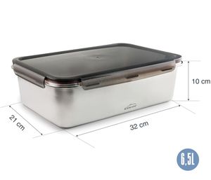 Lacor EcoInox er en matboks laget i høykvalitets 18/10 rustfritt stål, med en kapasitet på 6600 ml (mål: 37x25,5x11cm). Perfekt til å ta med seg lunsj, mellommåltider eller oppbevare rester – uten lekkasje eller bekymringer.