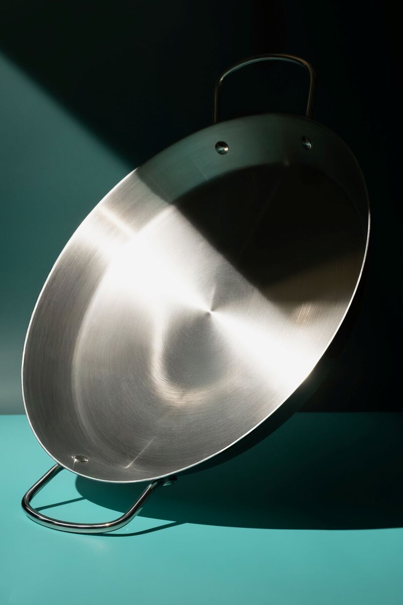 Pannen er bygget opp av rustfritt stål (18/10) kombinert med tre lag aluminium med en 3003-kjerne. Dette gir rask oppvarming og jevn varmefordeling over hele overflaten - ideelt for paella og andre retter som krever nøyaktig temperatur.