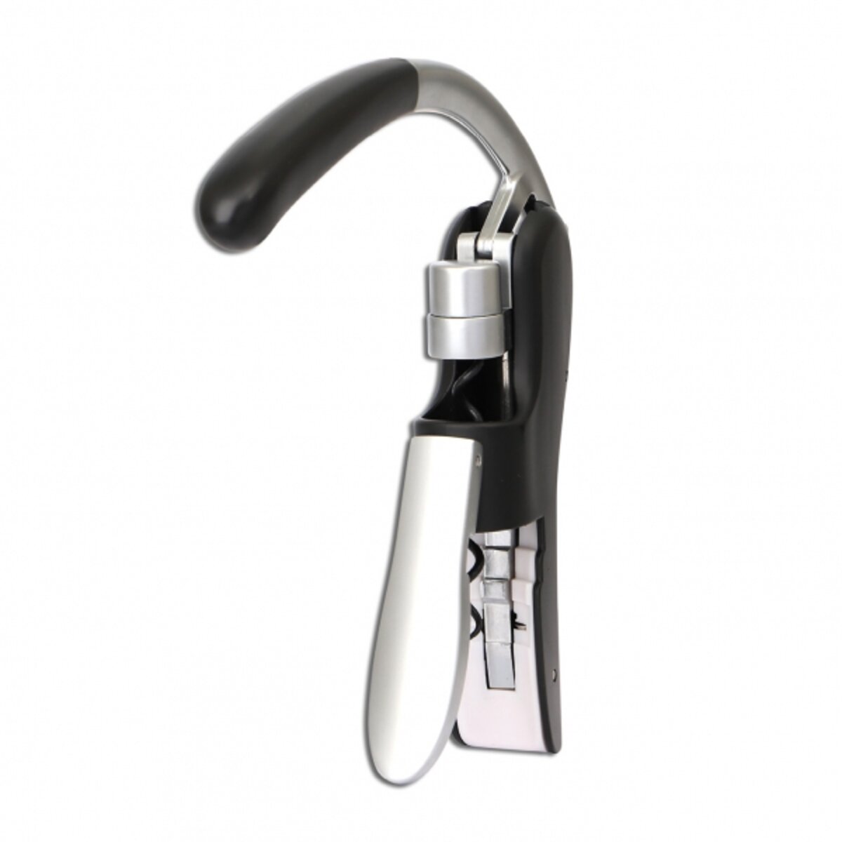 Vinopptrekker med et elegant design og funksjonalitet. Plasser korketrekkeren på flasken, trykk på håndtaket for å stabilisere. Deretter kan du presse håndtaket ned slik at spiralen tar tak i korken. Trekk deretter håndtaket opp for å frigjøre korken fra flasken.